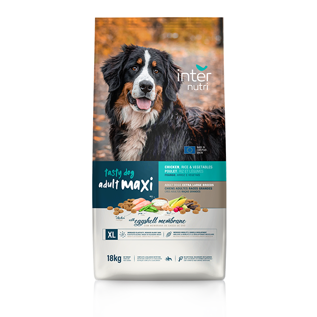 INTERNUTRI TASTY DOG ADULT MAXI – Frango, Arroz & Vegetais foi especialmente concebido para cães adultos de grande porte, com necessidades musculoarticulares mais exigentes. A membrana de casca de ovo promove mobilidade, maior elasticidade e reduz o risco de lesões. A fórmula rica em frango apoia a massa muscular e a energia diária, enquanto os nutrientes essenciais mantêm pele e pelo saudáveis. Elevada digestibilidade, reforço imunitário e bem-estar integral – sem corantes nem sabores artificiais. produzido na Europa.