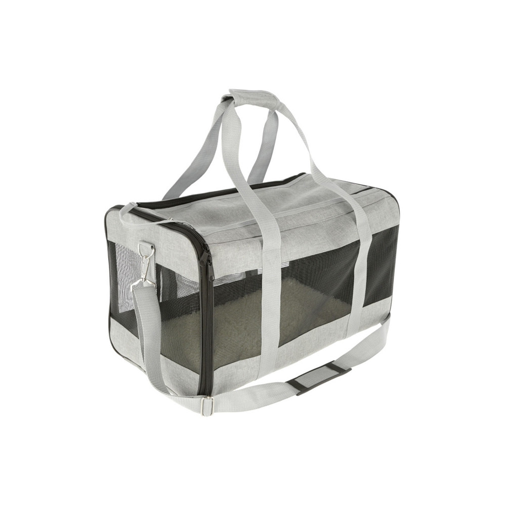 Esta mala de transporte com forro removível torna o transporte do seu animal de estimação mais confortável. Feito com tecido de elevada qualidade e resistente a arranhões, permite uma boa circulação do ar e visibilidade devido às transparências laterais. Contém um cabo curto ajustável, para prender à coleira, evitando que o patudo salte para fora. A mala está equipada com uma alça de ombro removível e ajustável e uma pega no topo da mala, tornando-se, assim, confortável para o tutor transportar. Pode ser aberta de lado e em cima e tem dois bolsos separados, para poder guardar os acessórios do seu amiguinho.
