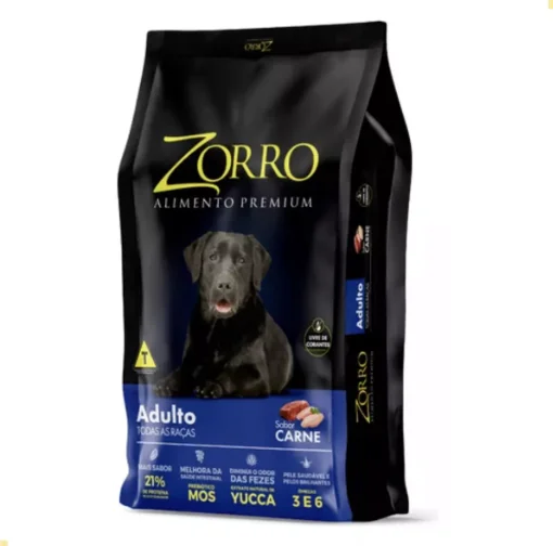 ZORRO PREMIUM ADULTO SABOR CARNE 15 kg é uma ração seca formulada para cães adultos de todas as raças. Ela oferece nutrição equilibrada e ingredientes que proporcionam energia e saúde ao seu pet no dia a dia.